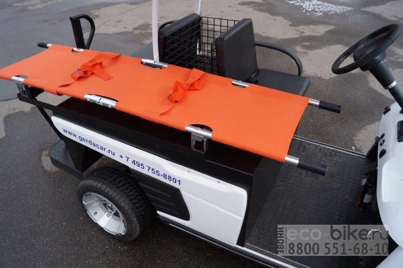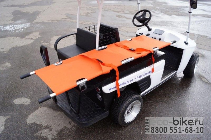 Специальная версия электромобиля для медиков. Кар незаменим при обслуживании крупных спортивных мероприятий. Небольшие размеры и маневренность его главный козырь. На любом стадионе или спортивной арене есть такой кар. Однако его применение будет актуально и в гостиничных комплексах и парках с узкими дорожками. Каждая секунда промедления при чрезвычайном проишествии имеет жизненно важную роль. Кар оборудован съемными носилками и нишей для медицинского чемодана. Опционально можно установить проблесковый маячок.