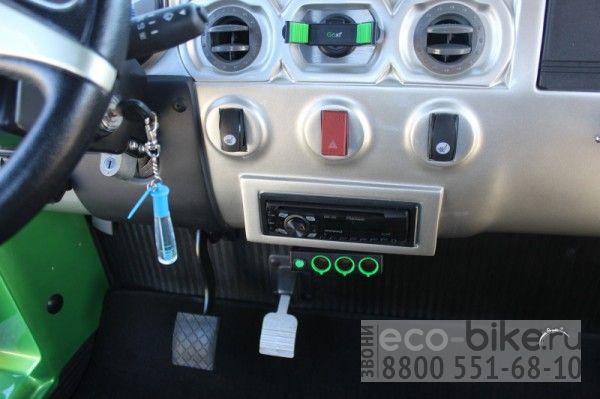 Лобовое стекло, сидения комбинированные замша+винил, ворсовые коврики, подлокотники, ремни безопасности, фары, хромированные зеркала заднего вида, подстаканники, перчаточный ящик, приборная панель, звуковой сигнал, индикатор заряда батареи, зумер заднего хода, легкосплавные диски, электрический отопитель, подогрев сидений, аудиосистема, стеклоочиститель, стеклоомыватель
